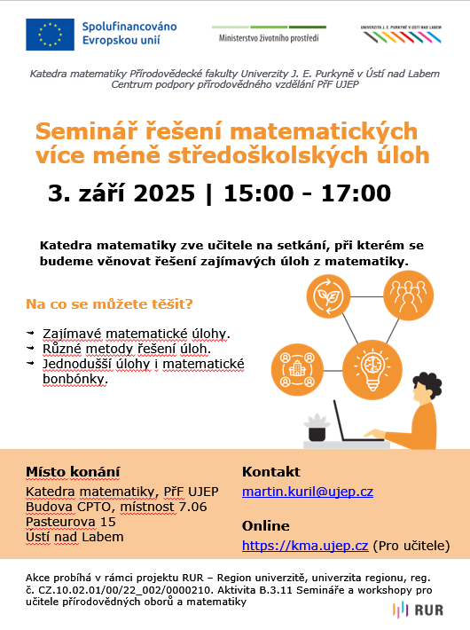 Zveme vás 3. září 2025 od 15:00 do 17:00 hodin na Seminář řešení matematických více méně středoškolských úloh, který se uskuteční na CPTO v učebně č. 7.06.