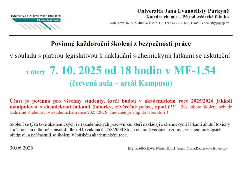 Účast je povinná pro všechny studenty, kteří budou v akademickém roce 2025/2026 jakkoli manipulovat s chemickými látkami (laborky, závěrečné práce, apod.).