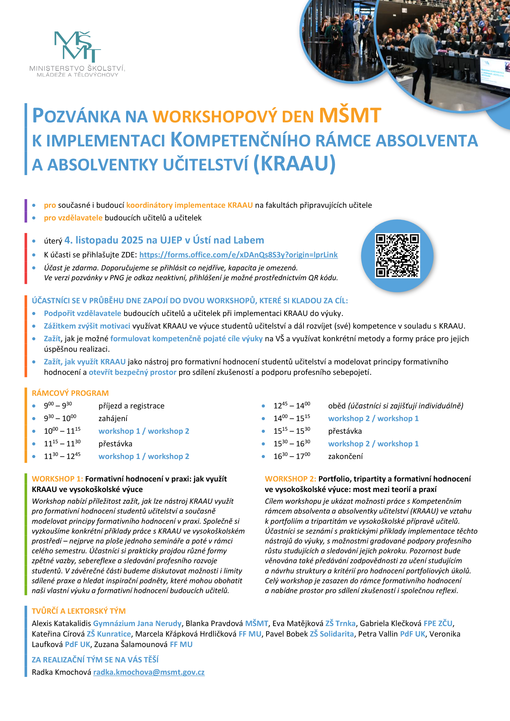Workshopový den organizuje MŠMT ve spolupráci s fakultami připravujícími učitele a realizačním týmem vedeným Radkou Kmochovou (MŠMT).