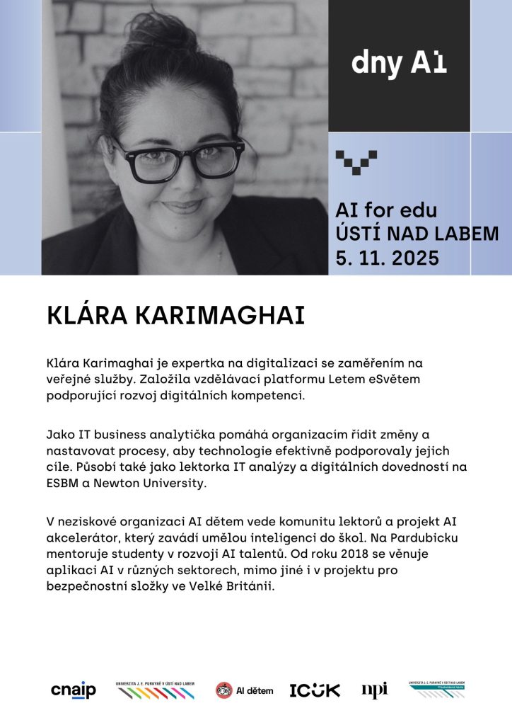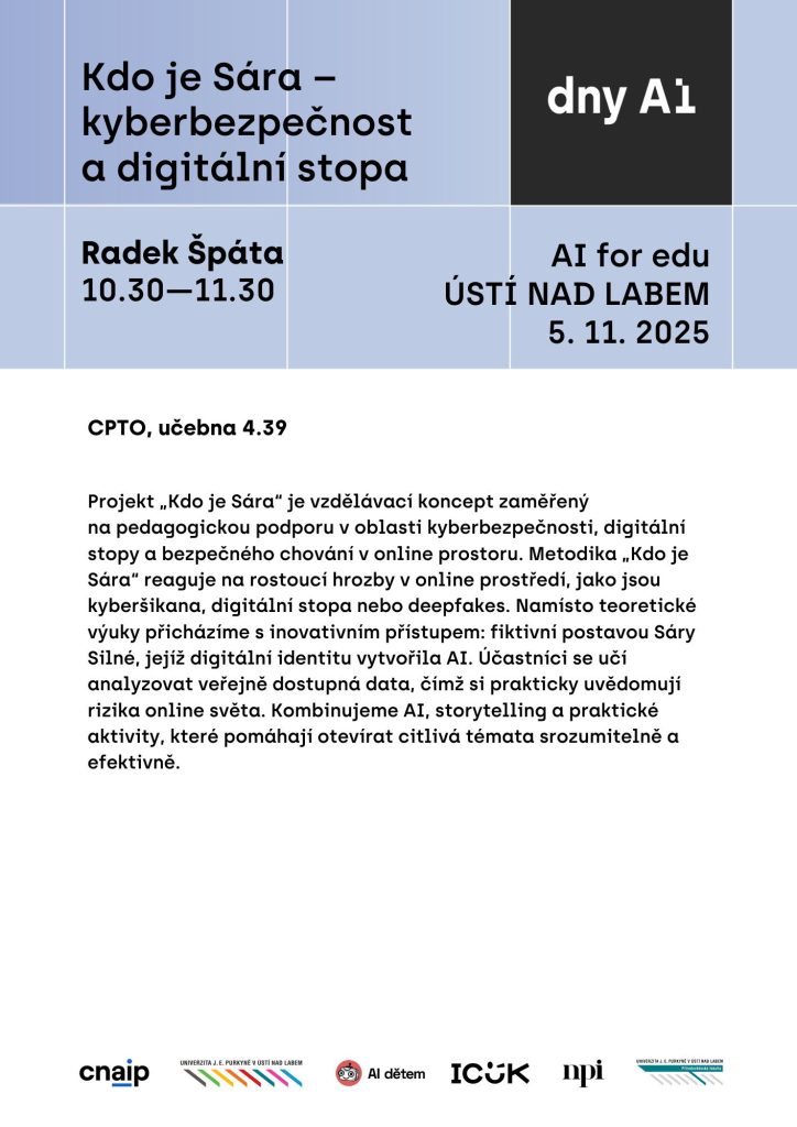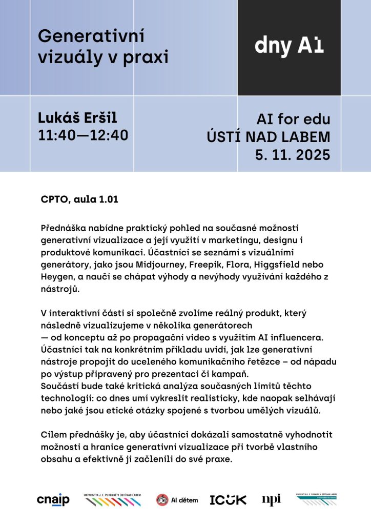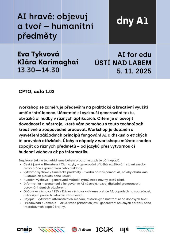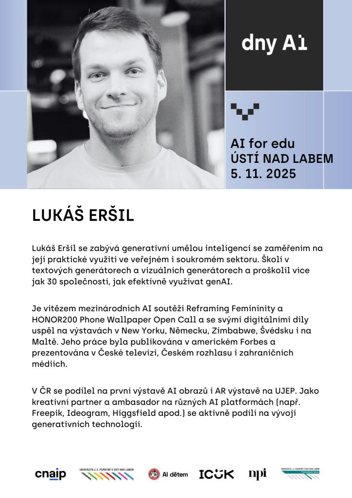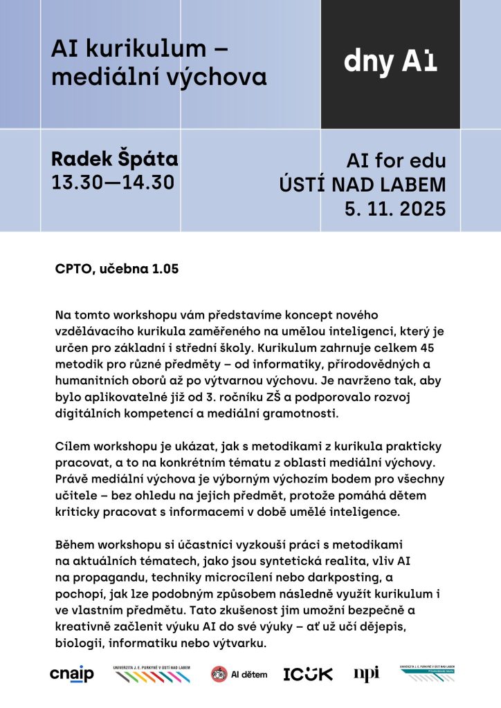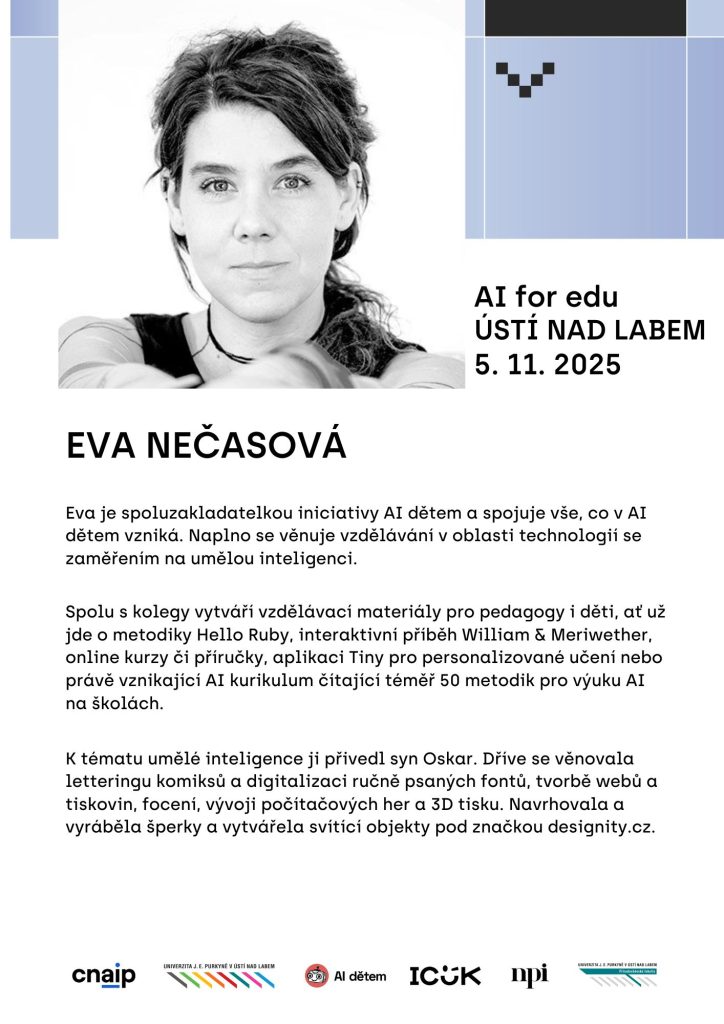 Akce je určena všem pedagogům, studentům učitelství, ředitelům škol i odborníkům ze vzdělávacího prostředí. Přihlášené účastníky čekají inspirativní přednášky a panelové diskuze o tom, jak AI proměňuje způsob učení, hodnocení i motivaci žáků, workshopy zaměřené na konkrétní nástroje a aplikace, které si účastníci budou moci sami vyzkoušet, sdílení zkušeností z praxe – učitelé z různých stupňů škol se podělí o to, co se jim při zavádění AI osvědčilo, a také networking a prostor pro diskuzi, který propojí akademickou a školní sféru.