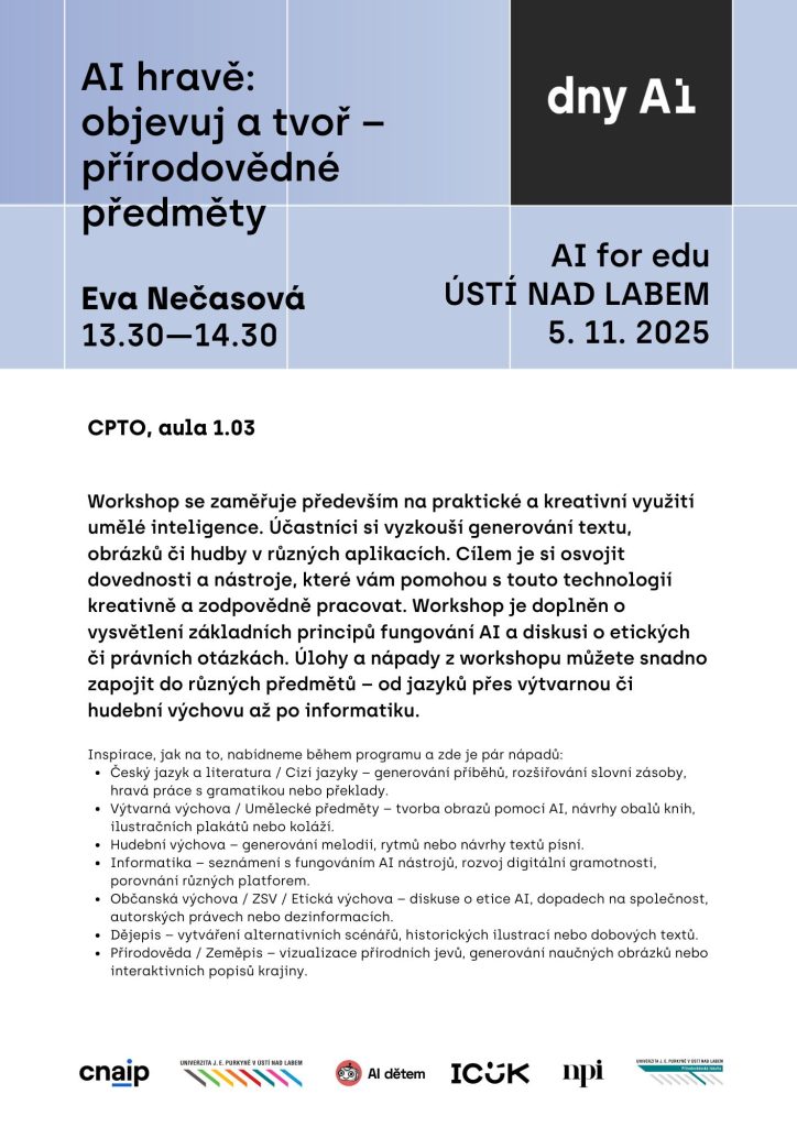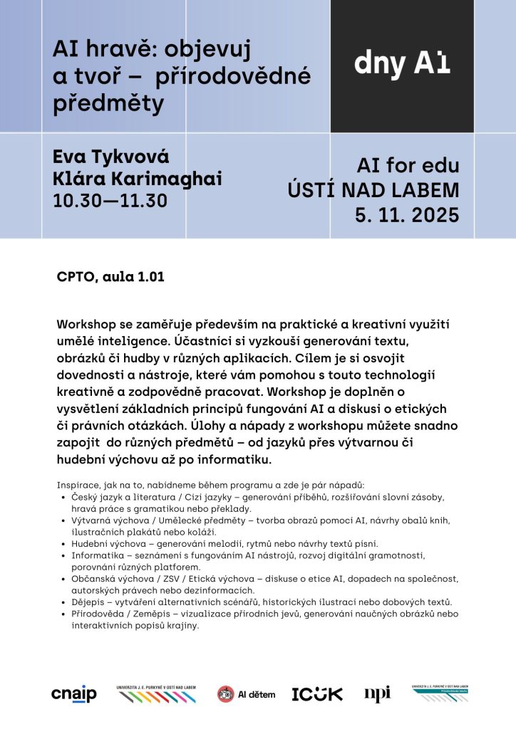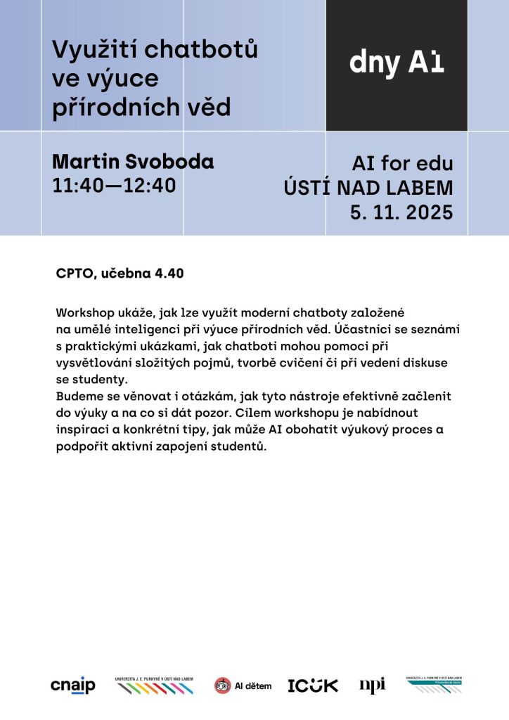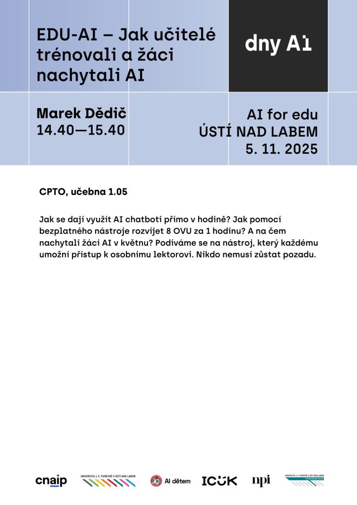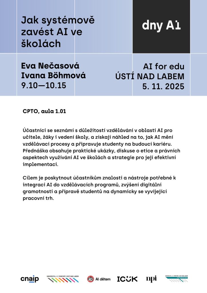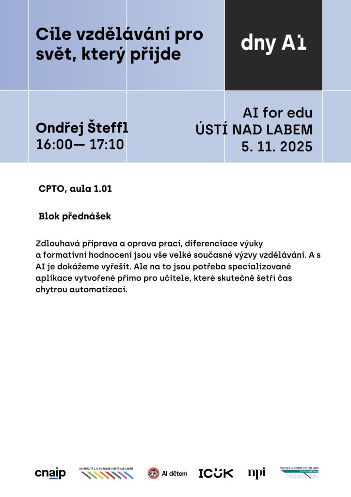 Umělá inteligence (AI) proniká do všech oblastí našeho života – a vzdělávání není výjimkou. Jak ji ale začlenit do školní výuky tak, aby přinášela skutečnou hodnotu učitelům i žákům? Právě na tuto otázku bude hledat odpovědi konference AI for edu, která se uskuteční v úterý 5. listopadu 2025 v Centru přírodovědných a technických oborů (CPTO) Přírodovědecké fakulty UJEP v rámci celorepublikového festivalu Dny AI 2025.