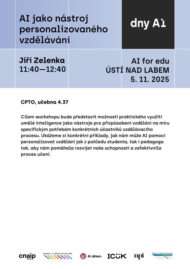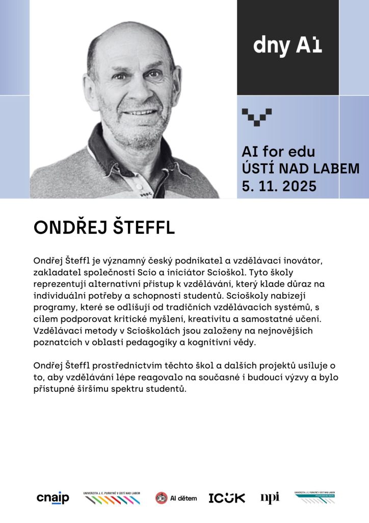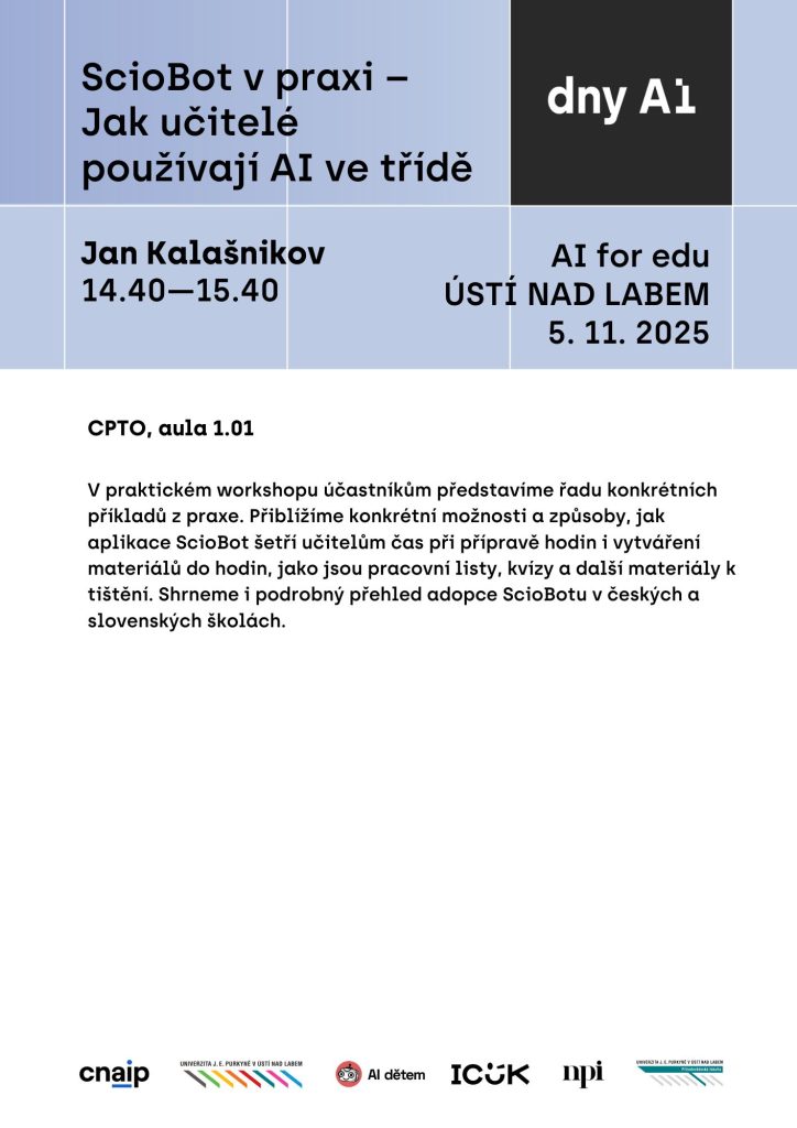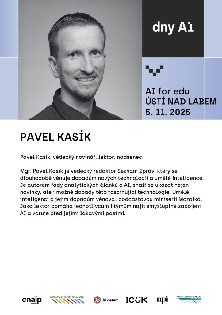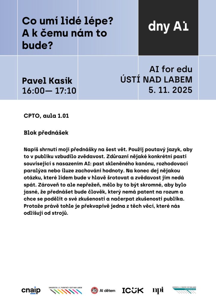 Umělá inteligence (AI) proniká do všech oblastí našeho života – a vzdělávání není výjimkou. Jak ji ale začlenit do školní výuky tak, aby přinášela skutečnou hodnotu učitelům i žákům? Právě na tuto otázku bude hledat odpovědi konference AI for edu, která se uskuteční v úterý 5. listopadu 2025 v Centru přírodovědných a technických oborů (CPTO) Přírodovědecké fakulty UJEP v rámci celorepublikového festivalu Dny AI 2025.