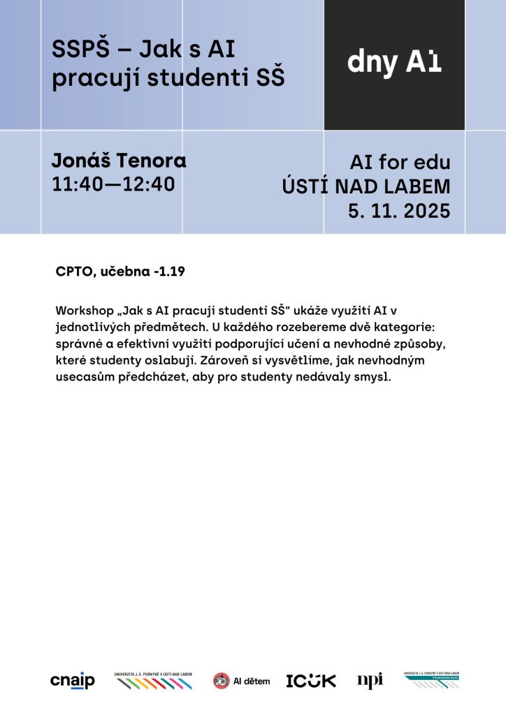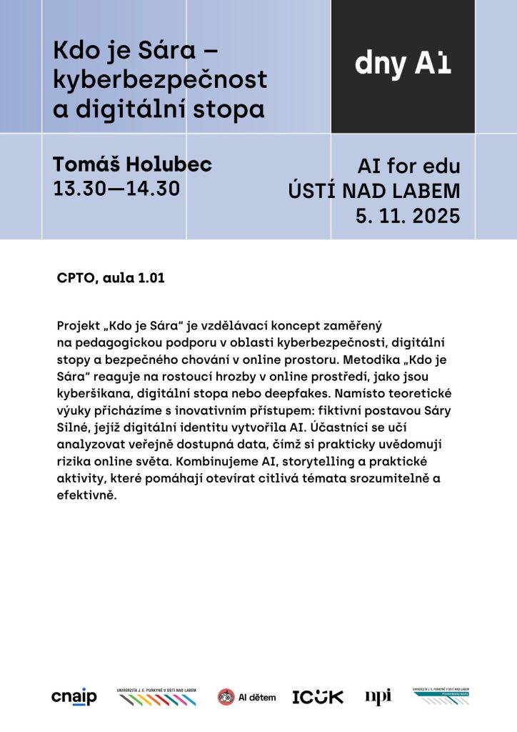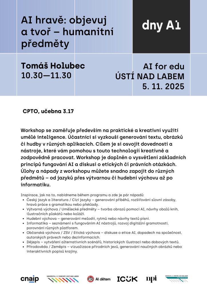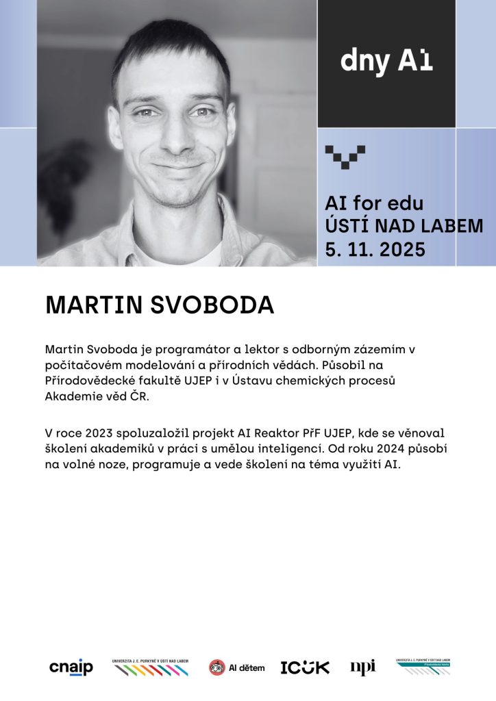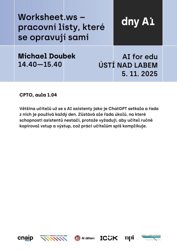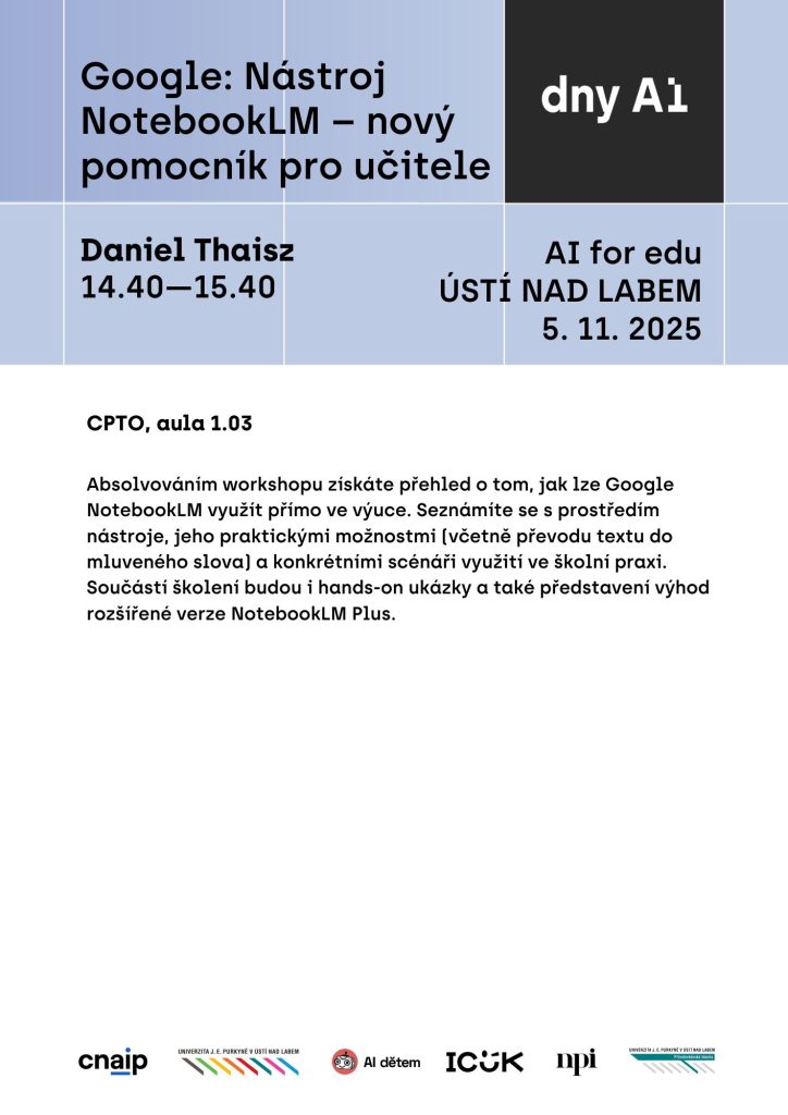 Umělá inteligence (AI) proniká do všech oblastí našeho života – a vzdělávání není výjimkou. Jak ji ale začlenit do školní výuky tak, aby přinášela skutečnou hodnotu učitelům i žákům? Právě na tuto otázku bude hledat odpovědi konference AI for edu, která se uskuteční v úterý 5. listopadu 2025 v Centru přírodovědných a technických oborů (CPTO) Přírodovědecké fakulty UJEP v rámci celorepublikového festivalu Dny AI 2025.