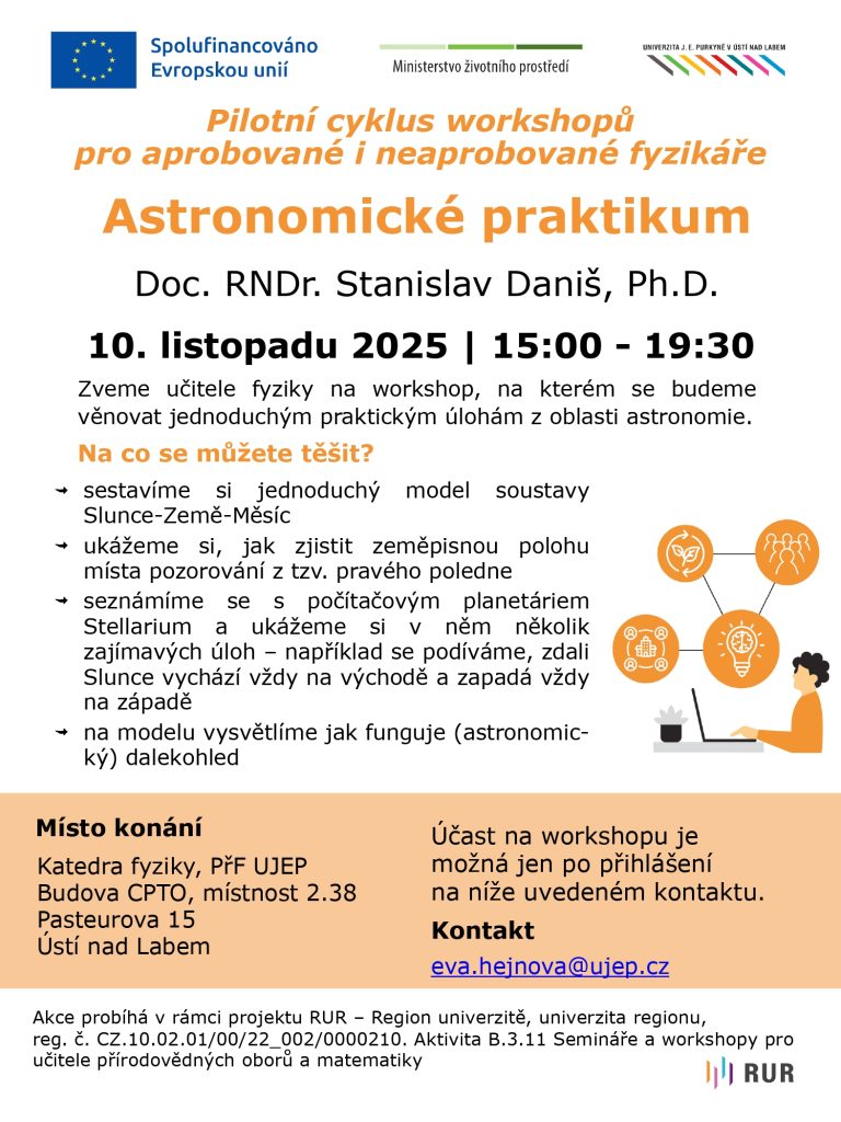 V rámci pilotního cyklu workshopů pro aprobované i neaprobované fyzikáře vás zveme na další workshop zaměřený na inspirativní aktivity z oblasti astronomie, který se koná v pondělí 10. listopadu 2025 od 15 h do 19.30 h v místnosti 2.38 na katedře fyziky (2. p.) v budově CPTO, Pasteurova 15, Ústí nad Labem.