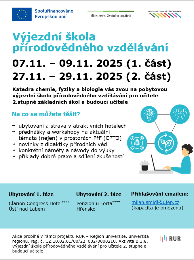 Akce probíhá v rámci projektu RUR – region univerzitě, univerzita regionu, reg. č. CZ.10.02.01/00/22_002/0000210. Aktivita B.3.8. Výjezdní škola přírodovědného vzdělávání pro učitele 2. stupně a budoucí učitele