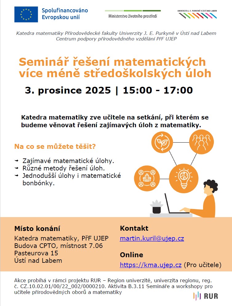 Zveme vás na další seminář řešení matematických více méně středoškolských úloh, který se koná ve středu 3. prosince 2025 od 15 h do 17 h v místnosti 7.06 na katedře matematiky (7. p.) v budově Centra přírodovědných a technických oborů, Pasteurova 15, Ústí nad Labem.
