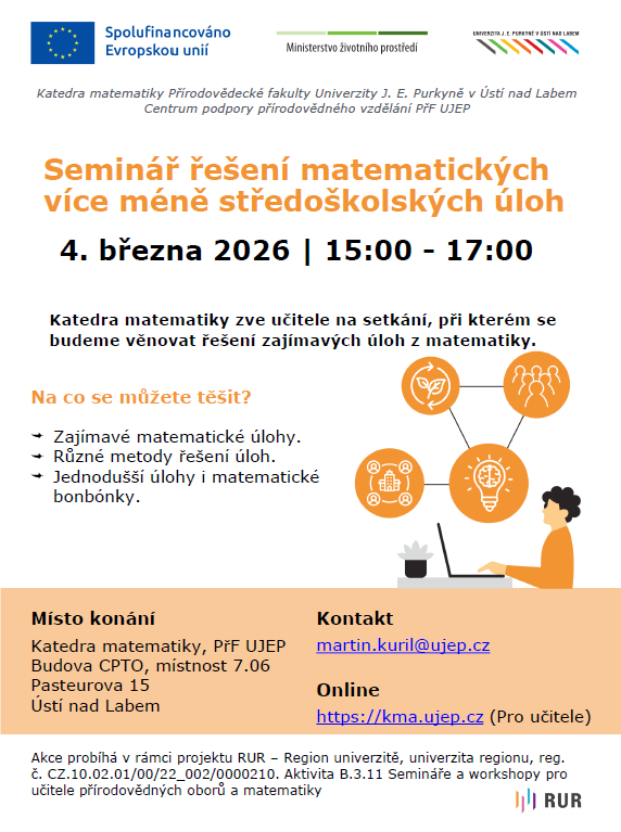 Zveme vás na další seminář řešení matematických více méně středoškolských úloh, který se koná ve středu 4. března 2026 od 15 h do 17 h v místnosti 7.06 na katedře matematiky (7. p.) v budově Centra přírodovědných a technických oborů, Pasteurova 15, Ústí nad Labem.