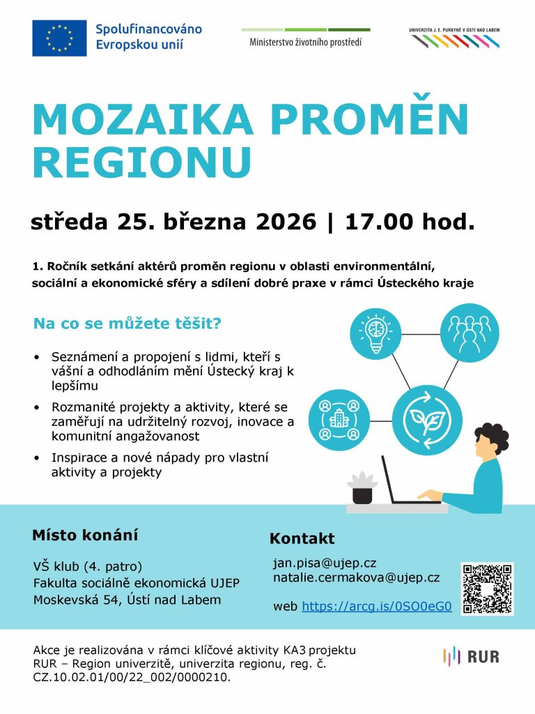25. března 2026 se uskuteční setkání “aktérů změny”, které spojuje “Mozaika proměn regionu”, na níž se podílejí odborníci z naší fakulty a Fakulty sociálně ekonomické UJEP. První společné setkání, kde si můžete poslechnout inspirativní příběhy aktérů změn z Ústeckého kraje a pobavit se o tom, jak se náš region proměňuje, proběhne od 17:00 hodin ve VŠ Klubu FSE UJEP.